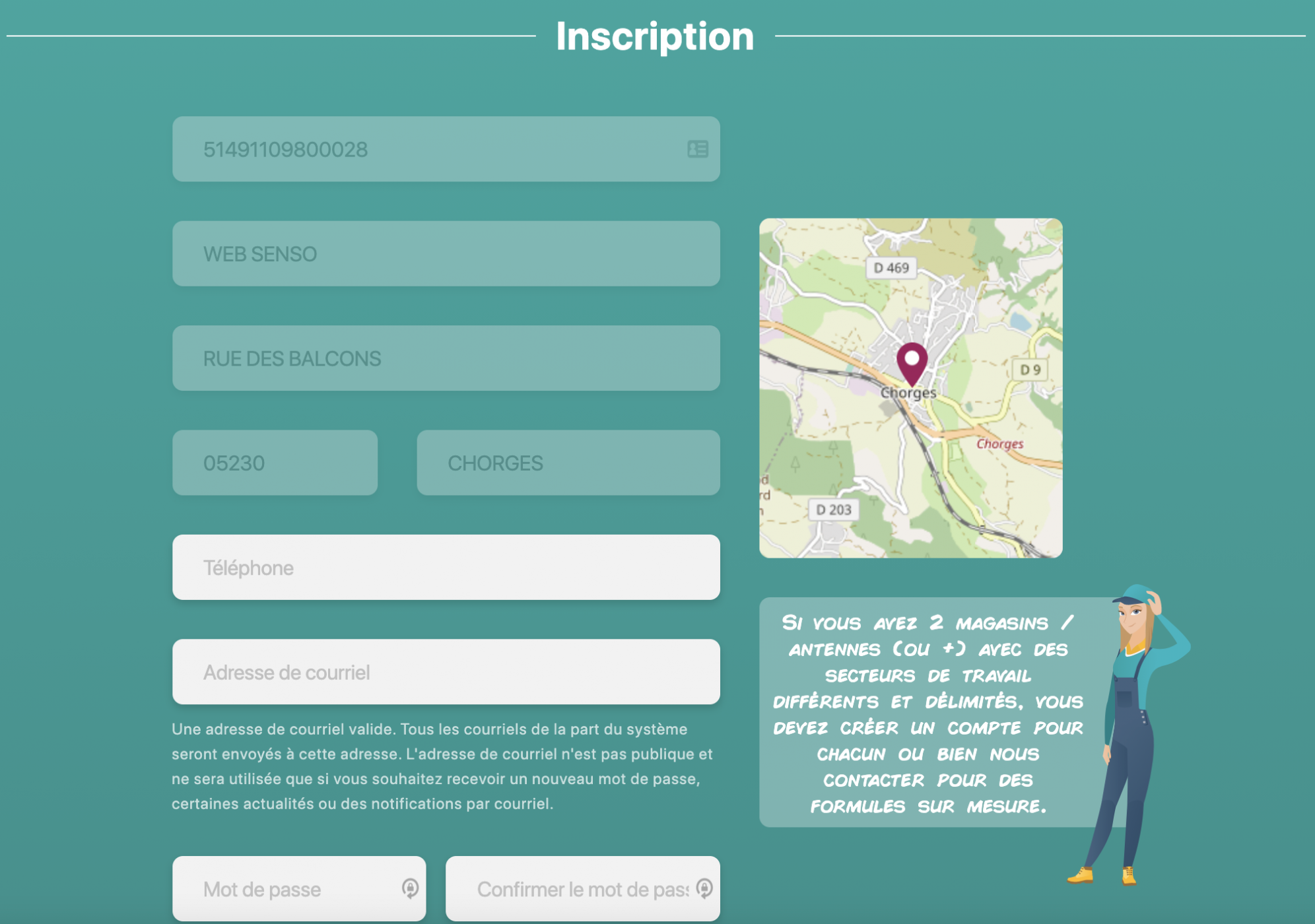 Vous commencez tout d'abord par saisir le numéro de SIRET de votre entreprise afin que vos coordonnées soient pré-remplies automatiquement ! Votre siège social est ainsi géolocalisé et votre compte sera ensuite créé pour poursuivre votre inscription et garder en session votre inscription.